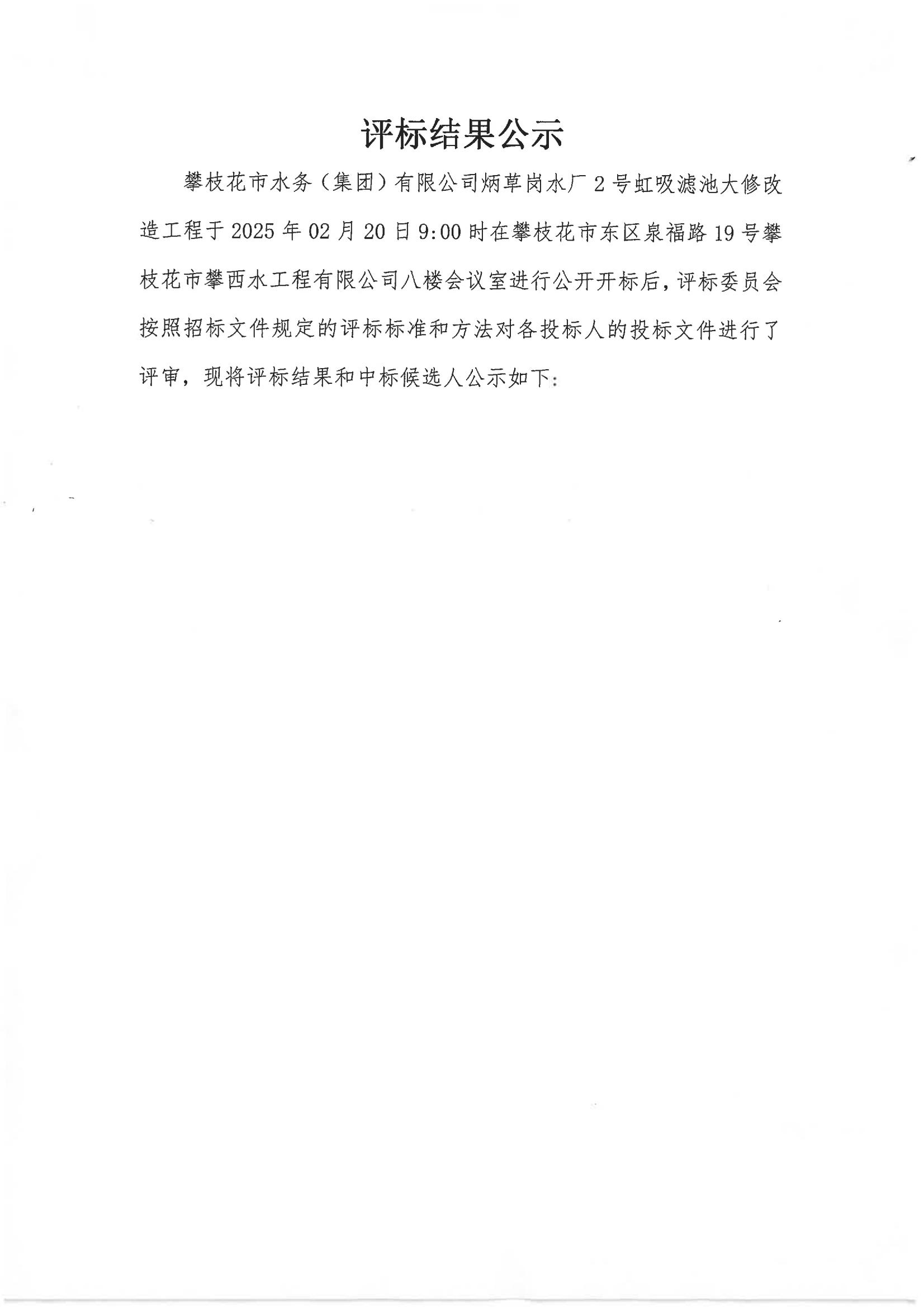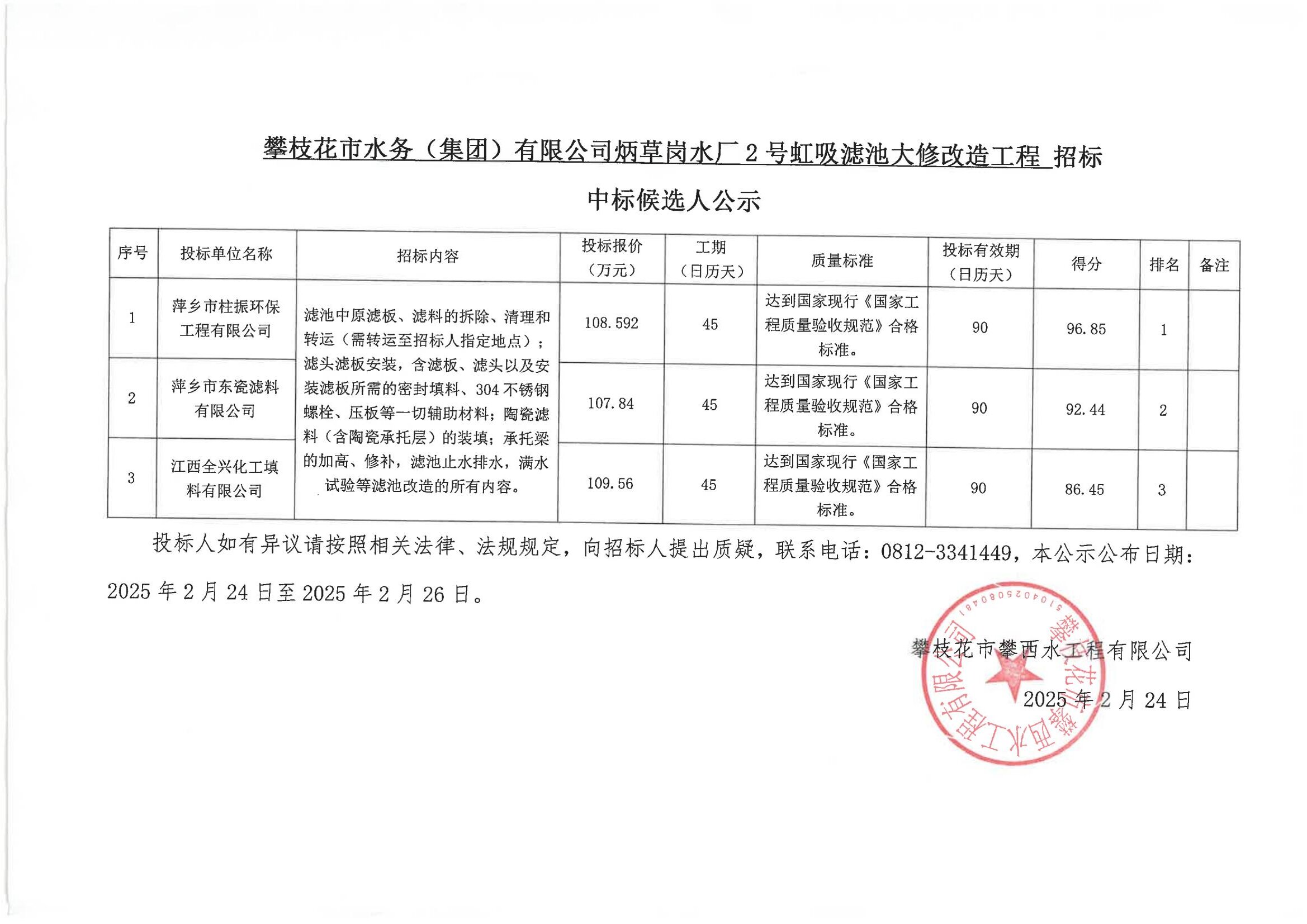 攀枝花市水務(wù)(集團(tuán))有限公司炳草崗水廠2號(hào)虹吸濾池大修改造工程中標(biāo)候選人公示