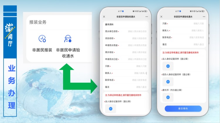 當用水施工完成,達到通水條件,用戶同樣可在“微網廳”中,辦理驗收通水申請,填寫相關信息,上傳附件,提交預約,后臺工作人員會主動聯系用戶,進行驗收通水。