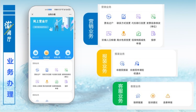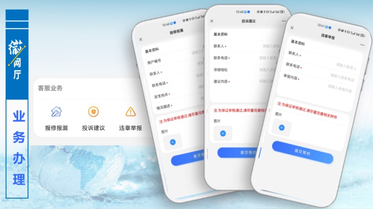 客服業務版塊主要是針對報修報漏,只要提交相關信息,工作人員會及時與用戶取得聯系進行處理。“微網廳”已開通投訴建議通道,對用戶提出的投訴和建議,將會第一時間進行回復和處理,同時歡迎大家對身邊的違章用水現象進行舉報。