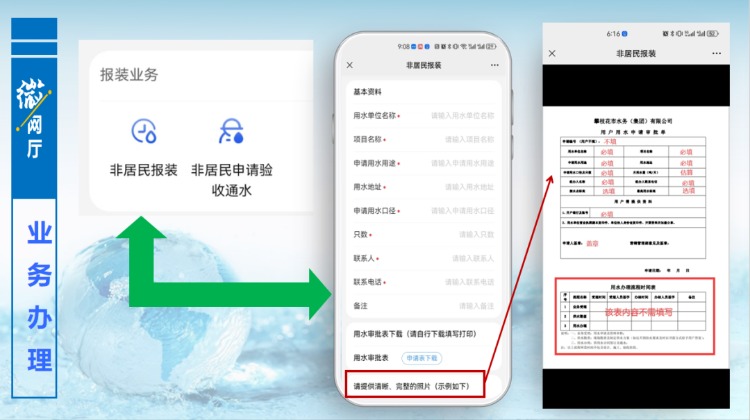 用戶可在報裝業務版塊中申請獲得用水。進入報裝業務版塊,下載用水審批表,按照示例圖片,完善表格內容,再拍照上傳,填寫好相關信息及附件,提交預約后,由后臺工作人員接單,進入辦理流程,流程完結,告知申請人是否滿足接水條件,完成報裝申請。