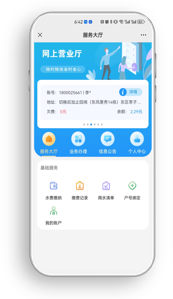 按照提示步驟,綁定用水開戶賬號后,就能輕松便捷使用“微網廳”各項服務功能。用水開戶賬號可查閱供水合同、服務短信或致電供水服務片區營業服務熱線進行查詢。