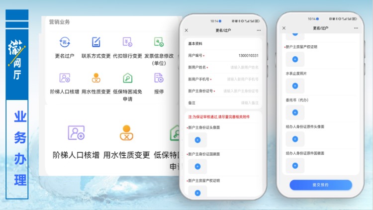 以更名過戶為例,用戶點擊更名過戶功能按鈕,進入提交資料界面,按照頁面提示,填寫相關信息和拍照上傳附件,提交預約,后臺管理人員審核通過,便完成更名過戶辦理,用戶無需再到營業大廳線下辦理任何手續。